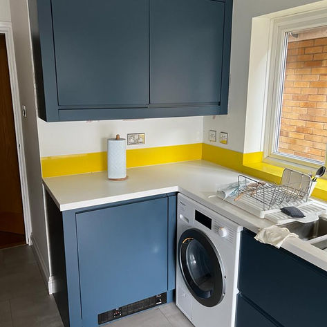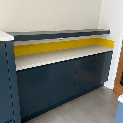 This tired kitchen was given a new lease of life, the original vinyl wrap was peeling so had to be removed. It was then primed and sprayed in its new F&B “Stiff Key Blue ”.