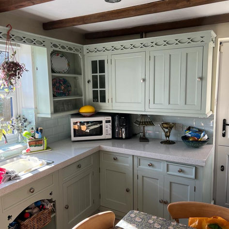 Luckily, I had a kitchen 3 drawer unit in stock which was used. My stone team came in and replaced all tops with a stunning 3 colour quartz, the kitchen was stripped, major filling and prep, followed by priming and their chosen colour of Little Greene co “juniper ash” sprayed as top coat.
