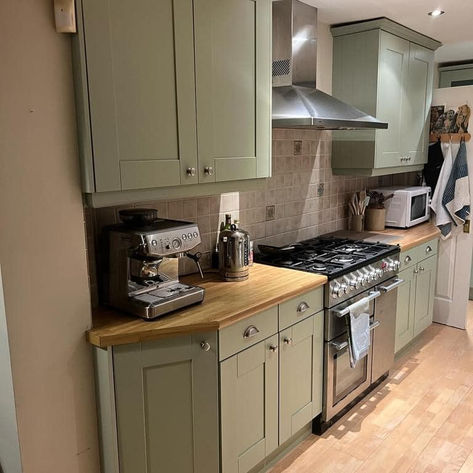 A 20 year old tired kitchen, stripped, sanded, primed and sprayed Little Greene co “Normandy grey” with new satin nickel handles.