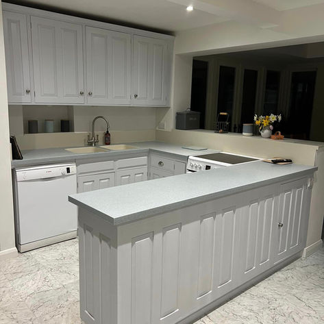 Stripped, prepared, old tops off and sprayed prime, followed by Little Greene co “Scree”. Refitted with new satin nickel hardware and Quartz tops, Upstands and sink.