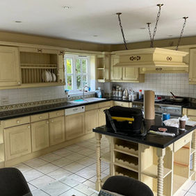 Stripped, sanded, doors resurfaced, wrapped, primed and the units sprayed Little Greene co “Normandy grey” and the island in little Greene co “Stock”