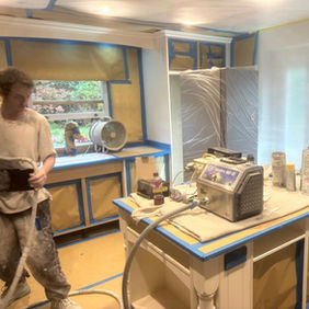 In we came…. Stripped, wrapped and masked, prepped, primed and sprayed its new little Greene co “gauze dark” livery.